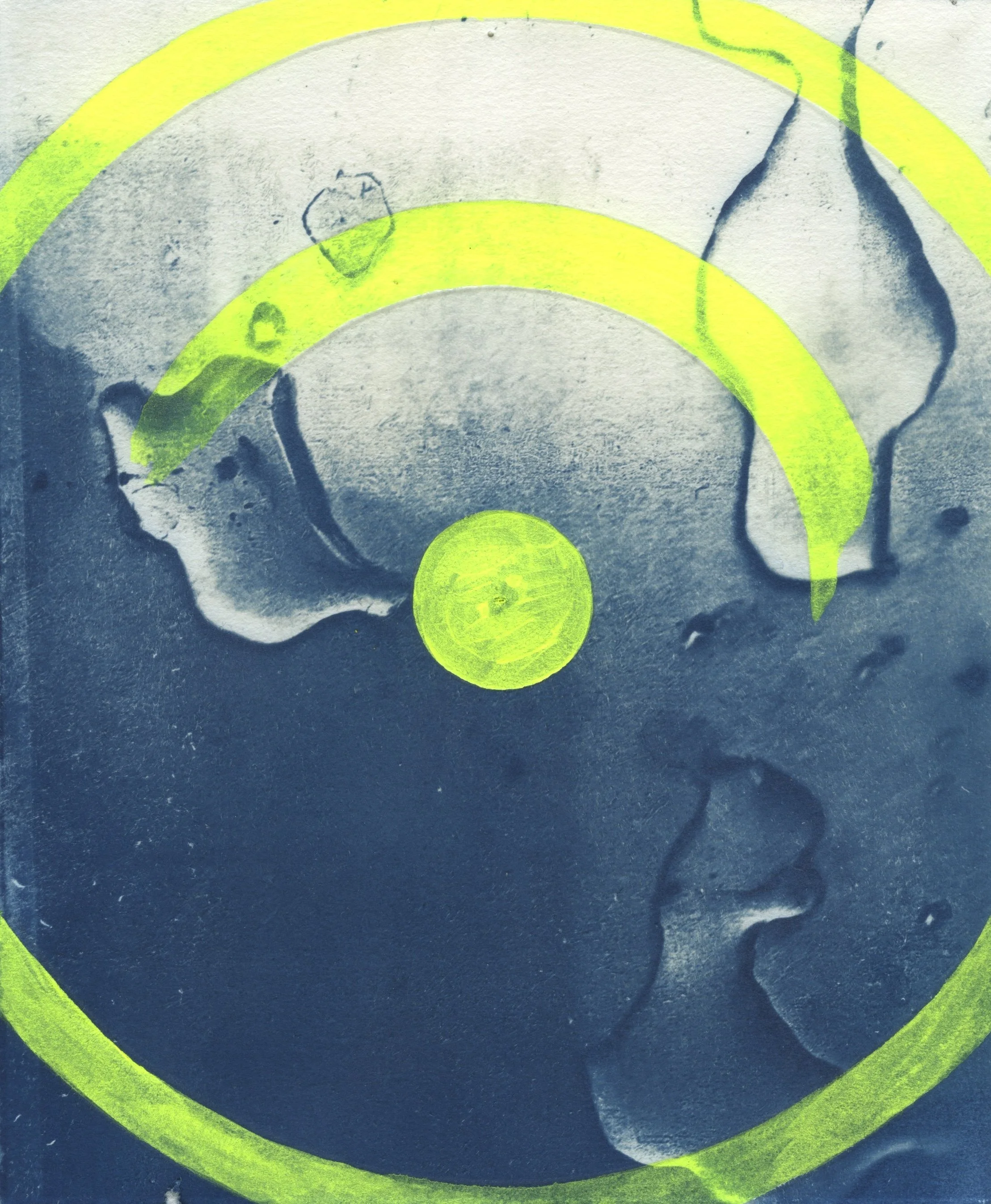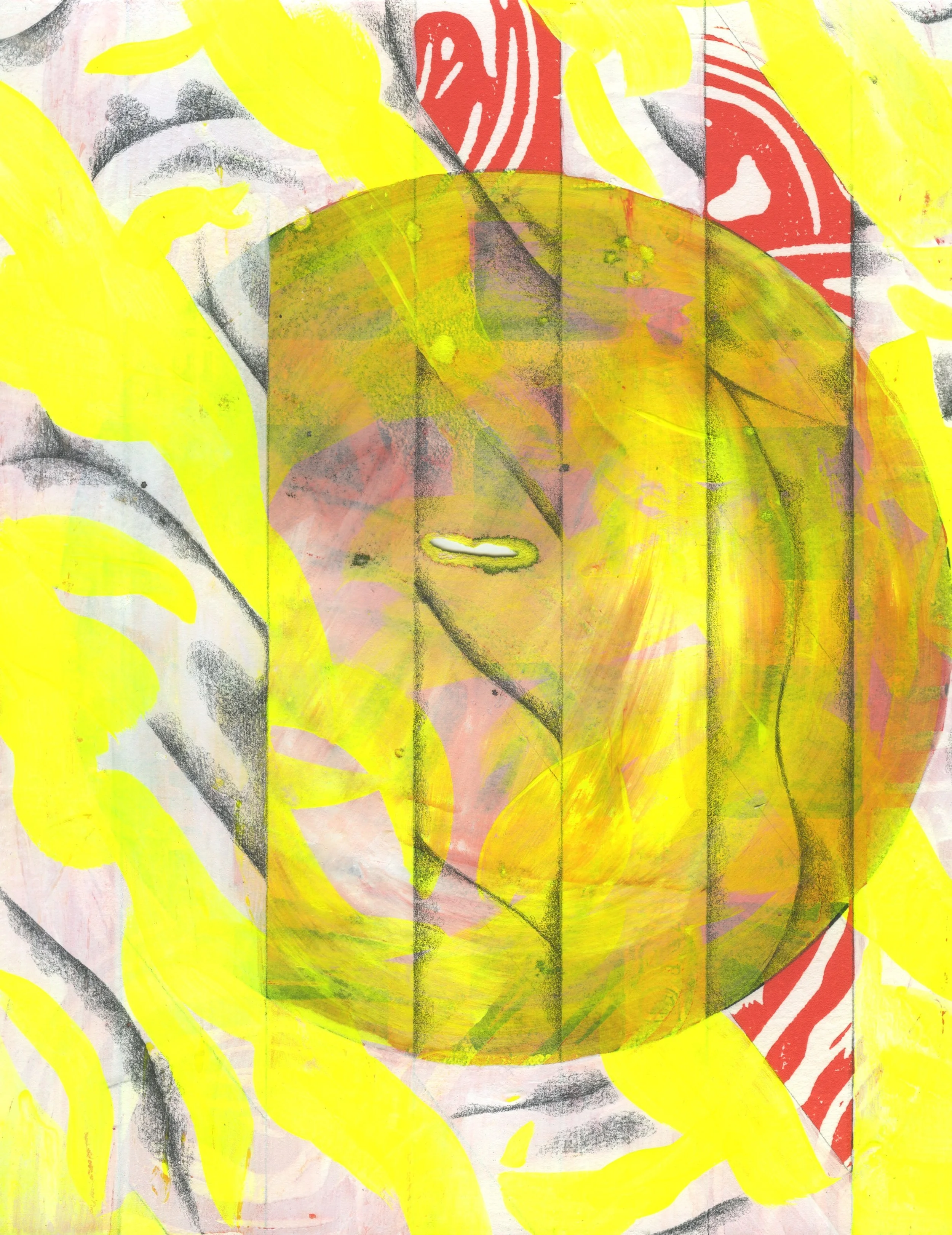 TRAPPED 1, 2025, Linocut, acrylic and graphite on paper, 11 by 15 inches.